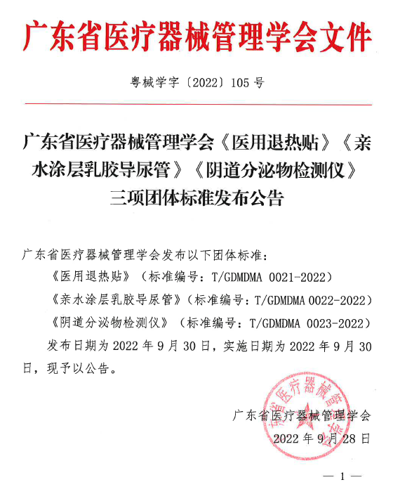 2022年9月30日,由我司主导起草的《亲水涂层乳胶导尿管》团体标准正式发布实施,这是我司主导制定的首个团体标准,是行业内首个专注于亲水涂层领域的标准,填补了行业标准中该领域的空白,为导尿管生产企业在涂层领域提供了标准性指引。