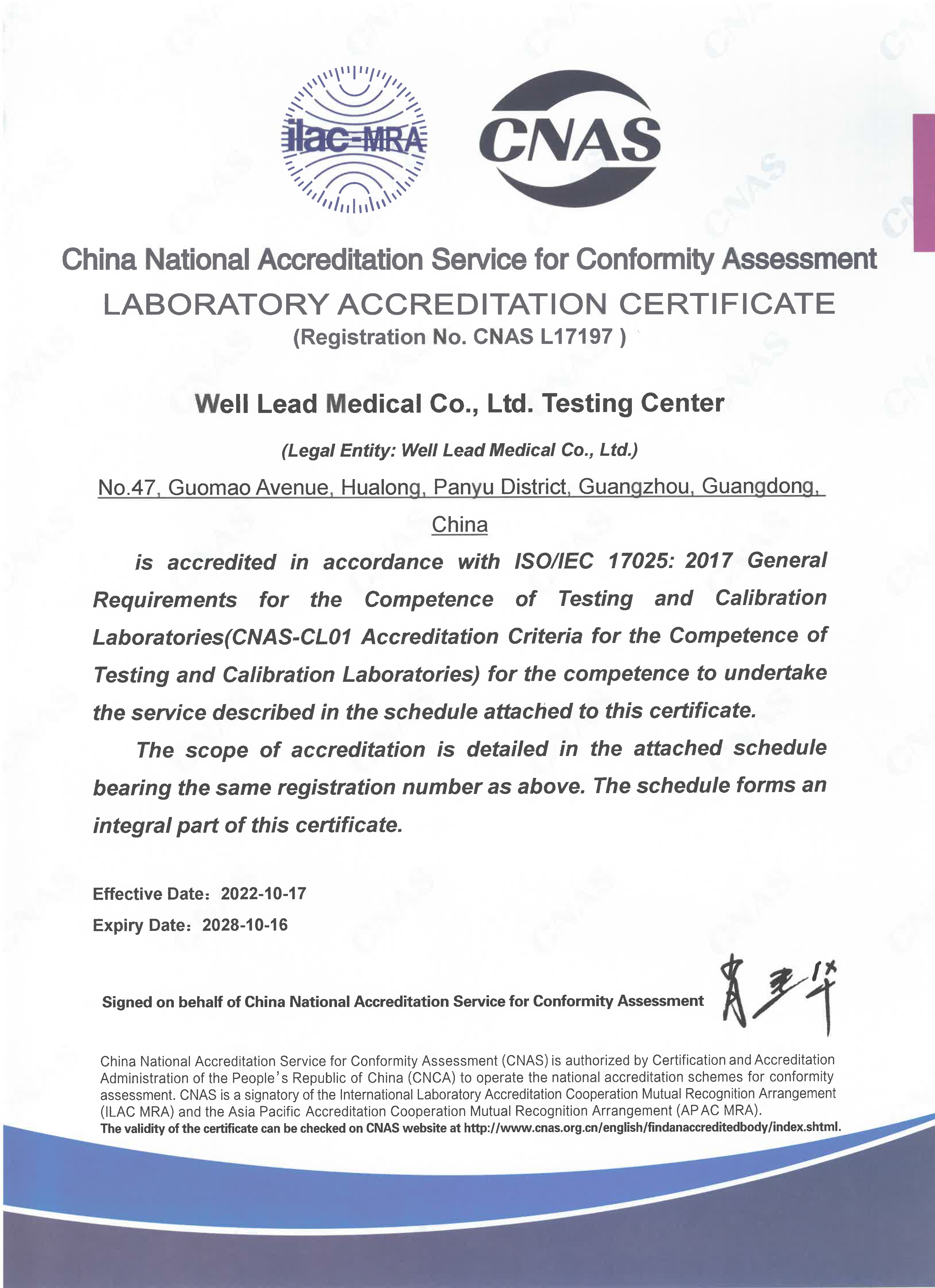 通过能力验证、内部质控活动,我司获得了CNAS的官方认可,标志着中国合格评定国家认可委员会对我司质量管理体系的高度肯定,也意味着我司检测中心达到国内《检测和校准实验室能力的通用要求》,能更好地服务公司总部以及子公司注册检测的需求。