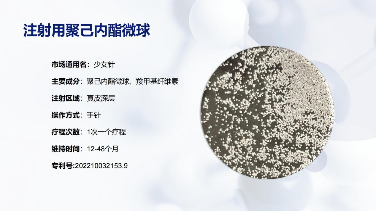 目前主营产品为注射用聚己内酯微球,是一款国家三类医疗器械产品,其主要用于皮下层植入,以纠正中到重度皱纹。由30%聚己内酯微球(PCL)和70%羧甲基纤维素(CMC)组成,其作用原理为 前期通过CMC凝胶载体进行即时填充,远期PCL微球长效刺激人体 自身的天然胶原蛋白新生,重塑胶原支架,产生自然、安全、持久 的效果。具有“填充+再生”双重功效。