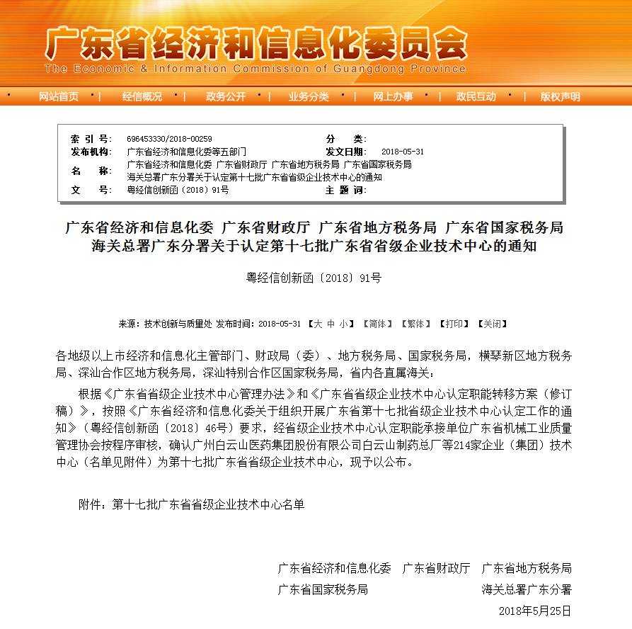5月31日,在广东省经济和信息化委员会网站公示的《广东省经济和信息化委、广东省财政厅、广东省地方税务局、广东省国家税务局海关总署广东分署关于认定第十七批广东省省级企业技术中心的通...